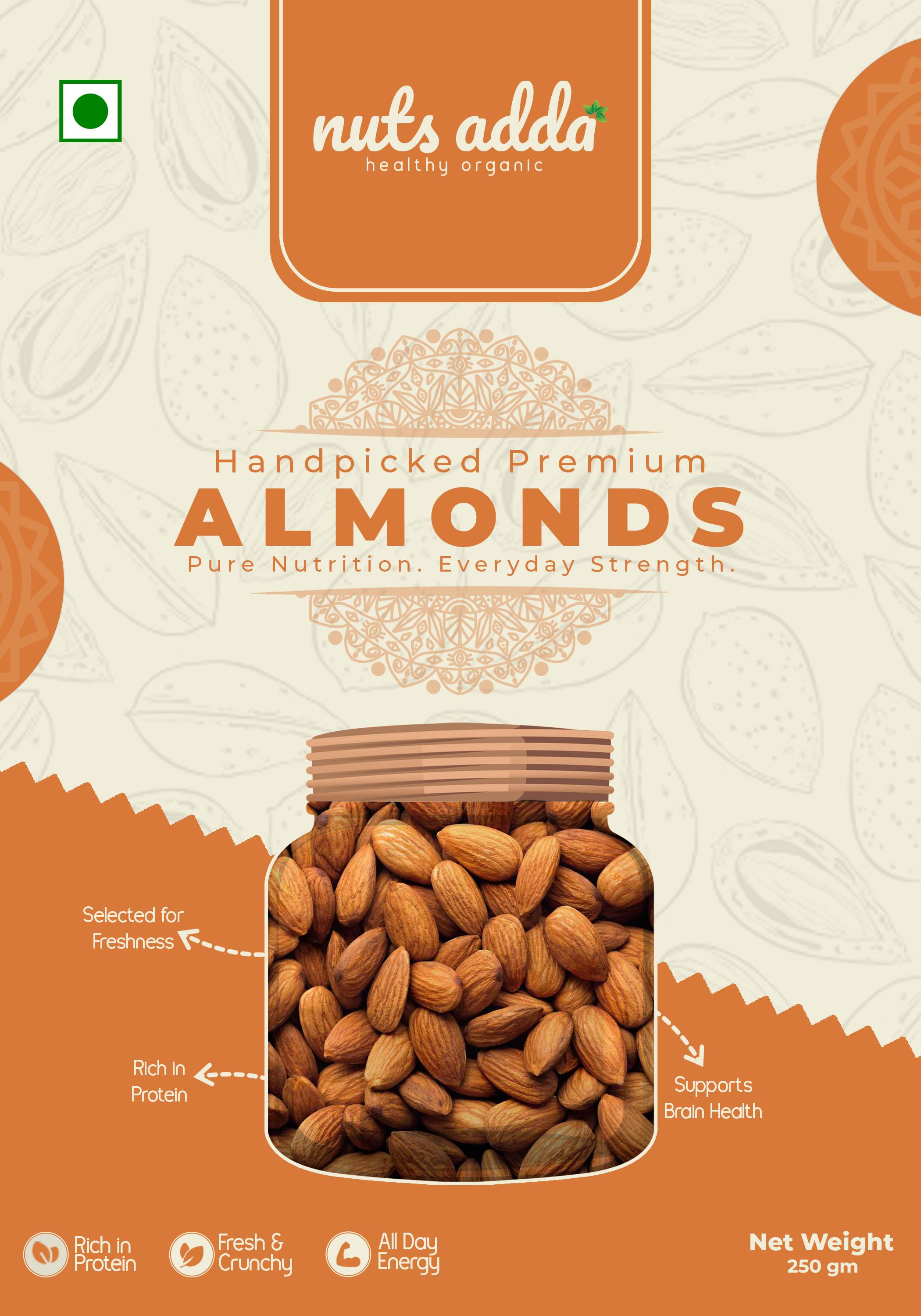 Experience the goodness of NutsAdda Premium Almonds, carefully selected for superior quality, taste, and nutrition. Rich in protein and essential nutrients, these almonds are ideal for boosting daily energy, supporting brain health, and maintaining an active lifestyle.
